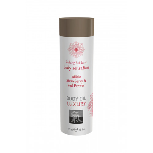 Съедобное массажное масло для тела Hot Shiatsu с ароматом клубники и красного перца станет идеальным компаньоном для эротического путешествия. Невесомая и приятная текстура масла позволяет легко скользить по телу не только руками, но и губами и языком. Натуральный состав полностью безопасен для поцелуев, а еще эффективно питает и увлажняет кожу. Чувственные прикосновения и интимные ласки окунают в восхитительный опыт и наслаждение. Ягодный и пикантный аромат клубники и красного перца расслабляет ум и стимулирует тело, а натуральный не приторный вкус подарит незабываемые ощущения и откроет новые грани интимной близости. Коллекция съедобных масел Shiatsu состоит из 8 ароматов. Попробуйте каждый и найдите свой. Масло подходит для ежедневного массажа, в результате чего кожа будет увлажненной, шелковистой и сияющей. Не использовать в качестве лубриканта. Объем: 75 мл.