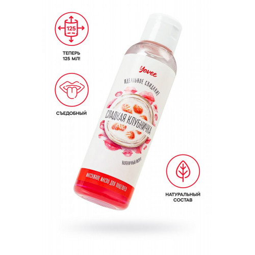 Массажное масло для поцелуев Yovee Сладкая клубничка со вкусом клубничного йогурта сделает свидание незабываемым. Ароматный сладкий массажный продукт дополнит парный романтический вечер или станет сочным уходовым средством для самостоятельного использования. Ощутите, как кожа наполнится влагой, станет мягкой и упругой. Яркий десертный аромат опьянит, раскрываясь на горячей коже роскошным шлейфом. Налейте масло в ладони или на кожу, разотрите тонким слоем, чередуя нежные и интенсивные движения. Несмотря на натуральный и безопасный состав масла для поцелуев Yovee Сладкая клубничка - это концентрат, поэтому не рекомендуется пить масло из флакона. Продукт не подходит для использования в качестве лубриканта. Идеи для свидания: Предложите партнеру сладкий массаж с особенной прелюдией. Лейте масло вдоль спины медленно, массируйте сначала ладонями, а затем телом. Начните слизывать приятное на вкус масло прямо с кожи. Не забудьте поменяться местами, предложив партнеру себя как десерт.