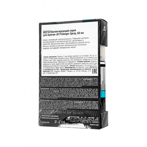 Спрей-пролонгатор для мужчин JO Prolonger - спрей, снижающий чувствительность. Повышает контроль над эякуляцией и чувствительностью, увеличивает и укрепляет сексуальный опыт. Интенсивный и долгий экстаз. Больше, сильнее и длиннее. Безопасный для латексных изделий , не содержит минеральных масел. Применение: сделать 3 или более нажатия (но не более 10) на головку и по всей длине полового члена . Предположительно за пять минут до полового акта. Дать средству впитаться или промокнуть салфеткой остатки перед половым актом. Партнерше не передается. Предупреждение: Только для наружнего применения. Хранение: держать в закрытом виде хранить в сухом месте при температуре не ниже 5С и не выше 25С. Состав:пропилен гликоль, вода, бензокаин 7,5%, ПЭГ-8, метилпарабен, пропилбарабен. Хранение: держать в закрытом виде хранить в сухом месте при температуре не ниже 5С и не выше 25С. Объем: 60 мл.
