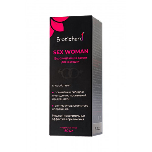 Капли возбуждающие для женщин Erotichard Sex Woman это натуральный негормональный концентрат на основе растительных компонентов, разработанный для нормализации работы женской репродуктивной системы и повышения сексуальной активности. Капли содержат мощные афродизиаки и природные адаптогены, способствующие увеличению кровообращения в области органов малого таза, что усиливает их чувствительность и улучшает сексуальные ощущения. Натуральные растительные компоненты оказывают мягкое воздействие на организм, не вызывая привыкания и не перегружая сердечно-сосудистую систему. Способ применения: Для достижения возбуждения и повышения сексуальной активности рекомендуется принимать 50 капель (примерно 5 мл) за 30–40 минут до предполагаемой близости. Капли употребляются в неразбавленном виде, что обеспечивает быстрое всасывание через слизистую оболочку рта. Объем: флакон-капельница - 50 мл.