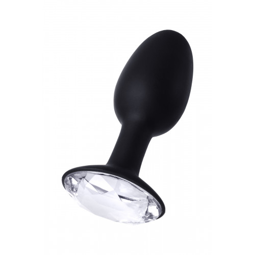 Гибкая анальная пробка овальной формы с прозрачным кристаллом.  Не только дарит приятные ощущения, но и радует глаз! Гибкая ножка позволяет максимально комфортно использовать втулку, а кристалл послужит незабываемым украшением. Размер: общая длина 10,7 см, рабочая длина 10 см, диаметр 3,5 см. Цвет: черный. Для более комфортного использования рекомендуем приобрести смазку на водной основе и очищающий спрей Clear Toy 100 мл для обработки изделия.