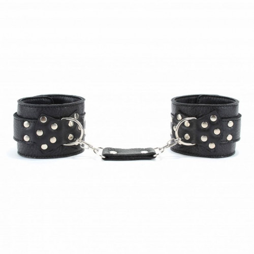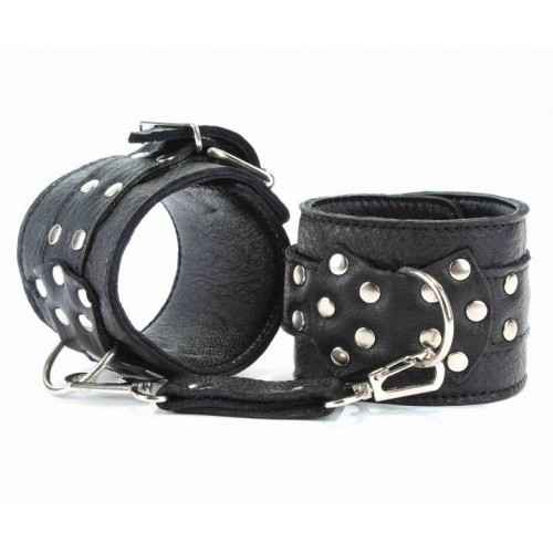 Оковы выполнены из натуральной кожи черного цвета. Декорированы заклепками и бантом с металлическим полукольцом. Оковы надежно фиксируются пряжками и ремнями, позволяющими выбрать нужный размер, подойдут на обхват от 18 до 27 см. Нежный подклад из перчаточной кожи обеспечивает комфорт, кожаное соединение на карабинах фиксирует оковы вместе. Аксессуар позволяет в полной мере насладиться сексом в стиле БДСМ. Ширина - 6 см.