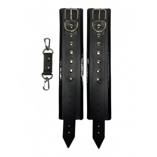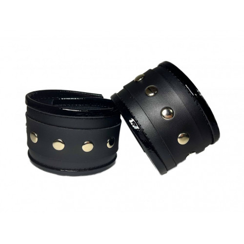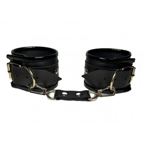 Красивые и функциональные наручники черного цвета, выполненные из искусственной кожи. Декорированы металлической фурнитурой и лаковыми вставками по краям. Обхват удобно регулируется с помощью пряжек. В комплекте идет соединение с карабинами. Очень экономичный, экологичный и практически незаменимый аксессуар для вашей любовной игры! Ширина - 5,5 см.