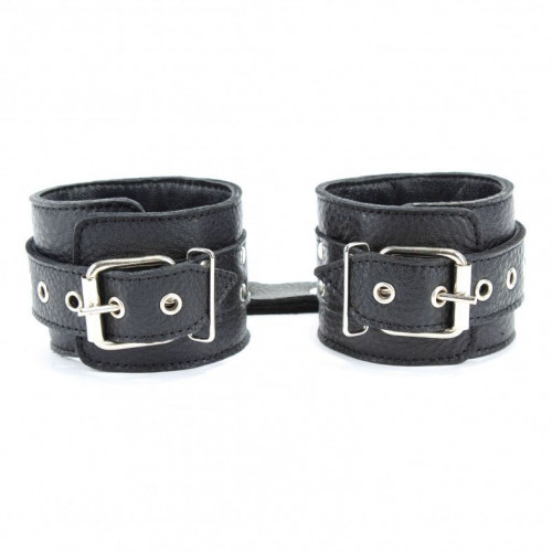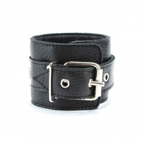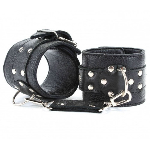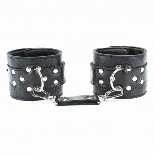 Наручники выполнены из натуральной кожи черного цвета. Изделие декорировано заклепками. По середине расположено полукольцо из сварной фурнитуры. Наручники надежно фиксируются пряжками и ремнями, позволяющими выбрать нужный размер, подойдут на обхват руки от 16 до 25 см. Кожаное соединение на карабинах фиксирует наручники вместе. Приятные для тела и стильные наручники отлично подходят для воплощения эротических БДСМ игр. Ширина - 6 см.