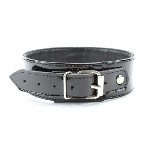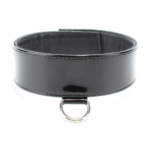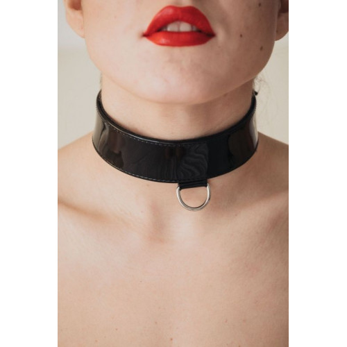 Ошейник выполнен из натуральной лаковой кожи черного цвета. Впереди находится металлическое полукольцо из сварной фурнитуры. Ремень сзади позволяет выбрать нужный размер, подойдет на обхват от 31 до 38см, металлическая пряжка надежно фиксирует аксессуар. Стильный аксессуар поможет воплотить эротические фантазии в реальность. Ширина - 3,5 см.