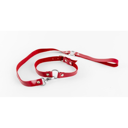 Яркий чокер с поводком, выполненный из натуральной кожи красного цвета. Общая длина поводка 60см, длина петельки 17см. Изделие декорировано двумя металлическими кольцами. Удобно регулируемая длина чокера подойдет на обхват шеи от 30 до 40 см. Нежная натуральная кожа очень комфортна в использовании. Ширина ремешков - 2 см.
