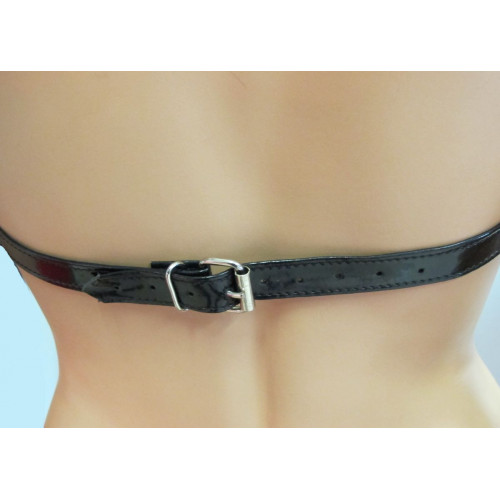 Сбруя выполнена из черной лакированной эко-кожи. Ошейник с мягким подкладом позволяем чувствовать себя максимально комфортно, а размер удобно регулируется тремя кнопками и подойдет на обхват шеи от 33 до 36см. Лиф из кожаных ремешков приподнимает грудь, придавая женским формам еще большую привлекательность. Подойдет на размены S, M. Сексуальный аксессуар не оставит равнодушным ни одного партнера. Ширина ошейника - 4 см.