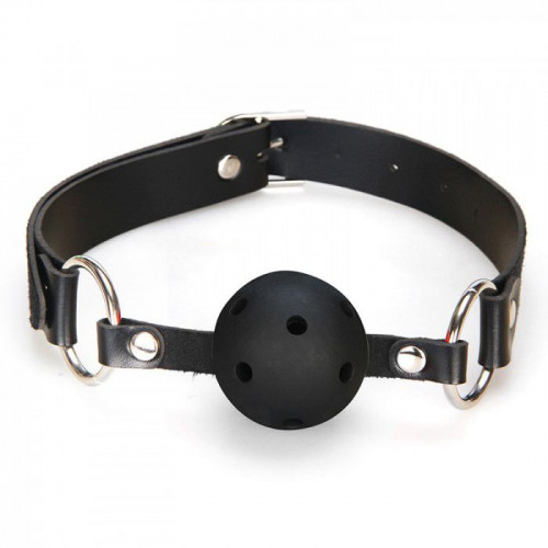 Черный кляп с пластиковым шаром с отверстиями для облегченного дыхания. Кляп застегивается на ремешок из искусственной кожи. Диаметр шарика - 4 см.