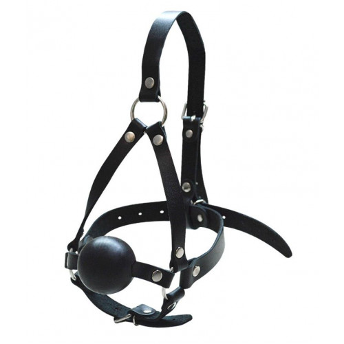 Черный кляп-шар со сбруей на голову из кожи