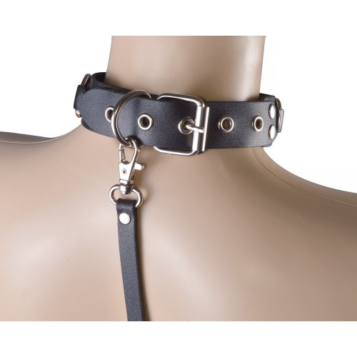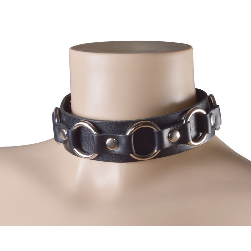 Ошейник изготовлен из натуральной кожи, декорирован шестью металлическими кольцам. Размер регулируется при помощи пряжки. Поводок кожаный.