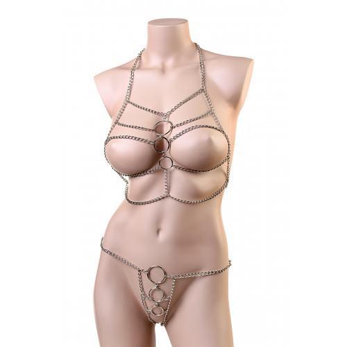 Откровенное бикини для особых случаев. Металлический блеск цепочек притягивает взгляд к его обладательнице. Этот наряд ничего не скрывает, а металл холодит кожу, возбуждая желание сделать ночь горячее. Обе части регулируются застежками и подходят размерам от S до XL.
