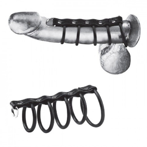 Хомут из черной экокожи с 5 резиновыми кольцами. Одно закрепляется за мошонкой, 4 остальных на пенис. Также есть кольцо для пристегивания других девайсов, например, поводка. Длина ремня - 12 см.