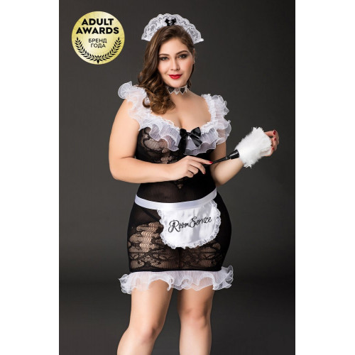 Костюм горничной добавляет эмоций любому интимному свиданию! Бесшовное платье-сетка с регулируемыми бретелями безупречно облегает фигуру. Контрастные рюши акцентируют внимание на декольте и стройных ножках. Ободок-чепчик украшен кружевом и серебристым стразом в форме сердца. Чокер подчеркивает длину шеи. Фартук с надписью Room Service и метелка помогают идеально вжиться в роль. Размер: 2XL.