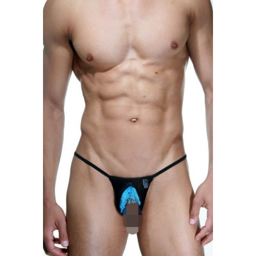 Тонкие стринги из мелкой сетки, с вырезом спереди и ярко-голубой бахромой.