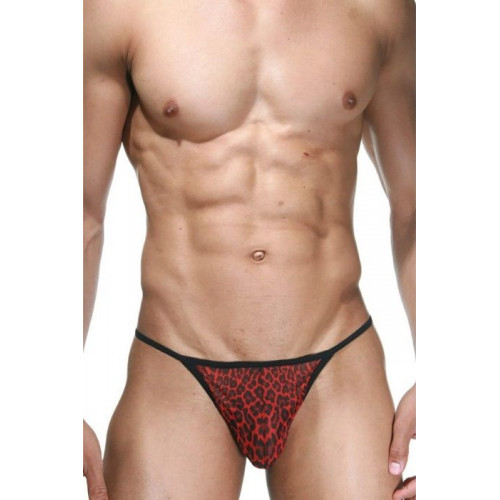 Мужские стринги, из двух видов ткани. Спереди - полупрозрачная тонкая мягкая ткань расцветки красный леопард, а сзади - черное кружево.
