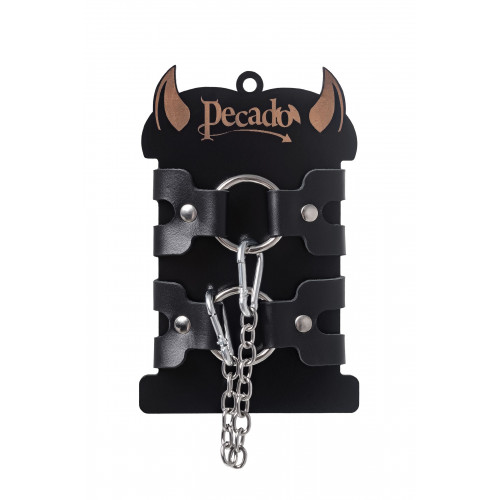Эти наручники-браслеты от Pecado – пикантная смесь брутальности и лаконичного дизайна. Данная модель - не просто девайс для ролевых игр, но и стильное украшение на руку. Наручники изготовлены из экологичной, прочной, натуральной кожи. Материал износостойкий, тактильно приятный. Благодаря качественной металлофурнитуре, аксессуар надежно фиксируется. Не расстегивается при активном использовании в процессе игр. Манжеты соединены между собой с помощью двух карабинов и короткой цепочки. При необходимости, можно использовать как более длинные цепи, так и другие аксессуары. Подходит для пар, которые только познают азы БДСМ-культуры, а также более опытным ценителям жестких игр. Погрузитесь в мир особых чувств и желаний! Вместе с Pecado. Длина ремешков - 8 и 12 см.