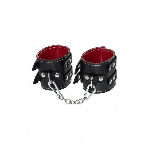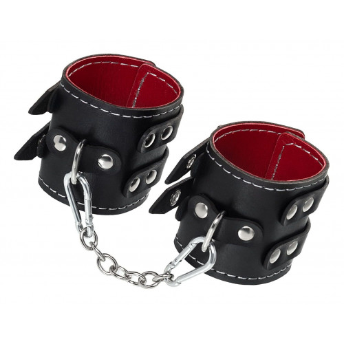 Черные кожаные наручники с двумя ремнями и красной подкладкой