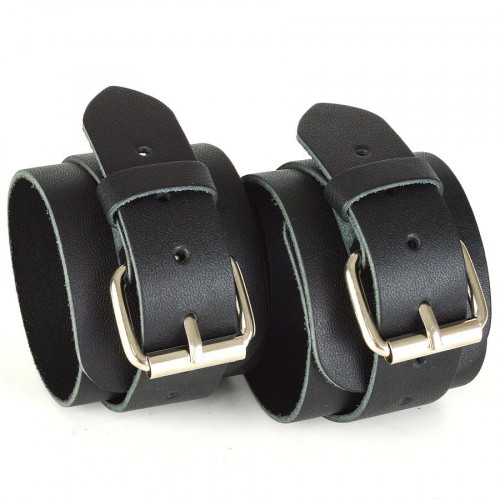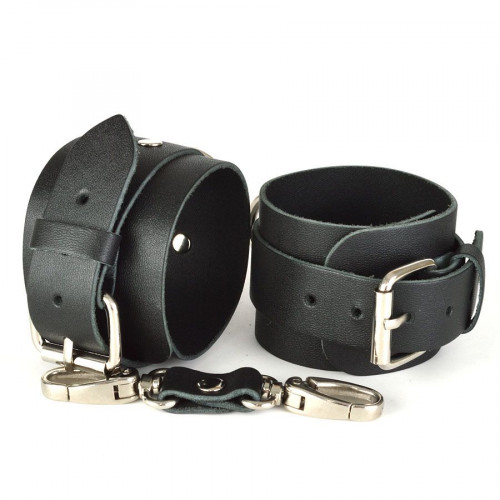 Наручники изготовлены из натуральной кожи. Соединяются перемычкой с двумя карабинами. Длина узкого ремешка с пряжкой - 31 см.