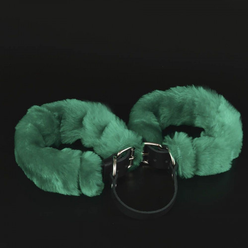 Ремешки наручников изготовлены из натуральной кожи и декорированы съемным искусственным мехом зеленого цвета.