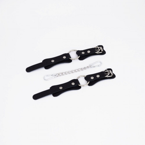 Изделие состоит из двух ремешков из натуральной кожи , соединенных посередине. Их лаконичный дизайн позволяет использовать их не только для фиксации рук в любовных играх, но и как модный аксессуар, который украсит ваш повседневный или вечерний образ. В комплект входит стальное кольцо и соединительный элемент в виде прочной цепочки с двумя надежными карабинами , которые обеспечивают стабильность и контроль.