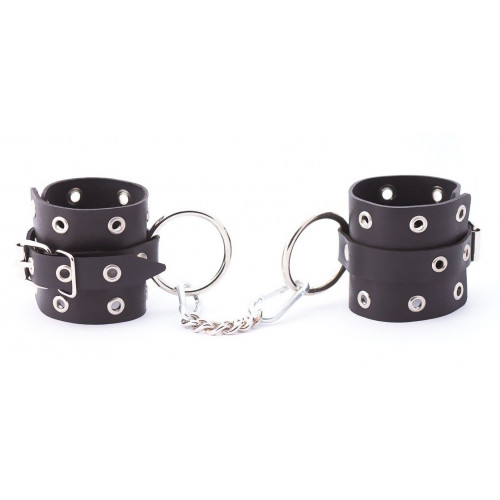 Кожаные однослойные наручники с люверсами. Наручники имеют кольца для крепления и металлическую сцепку. Ширина манжет - 6,5 см.