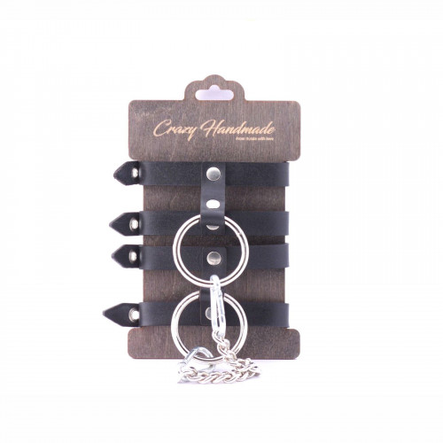 Оковы представляют собой два ремешка из натуральной кожи, соединенных посередине. Минималистичный дизайн позволяет использовать их не только для фиксации рук в любовных играх, но и в качестве аксессуара для дополнения образа. В комплекте стальное кольцо и соединительный элемент в виде прочной цепочки с двумя карабинами. Общая длина - 28 см.