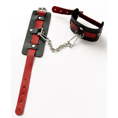 Кожаные оковы с контрастным декором и заклепками имеют кольца для крепления и металлическую сцепку.