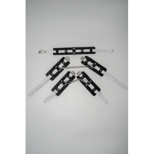 Наручники состоят из двух деталей: основа прямоугольной формы из натуральной кожи черного цвета и ремешок белого цвета с прочной хромированной фурнитурой в виде овального кольца. Расположение ремешка через прорези основной части является декоративным решением, а также служит для лучшей регулировки размера. В комплект входит соединительная цепочка с двумя карабинами.