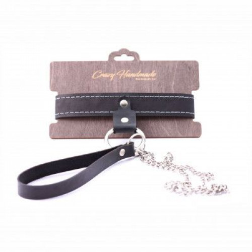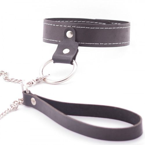 Узкий однослойный ошейник с поводком. Ошейник выполнен из натуральной кожи и имеет кольцо для крепления поводка. Ширина ошейника - 3 см.