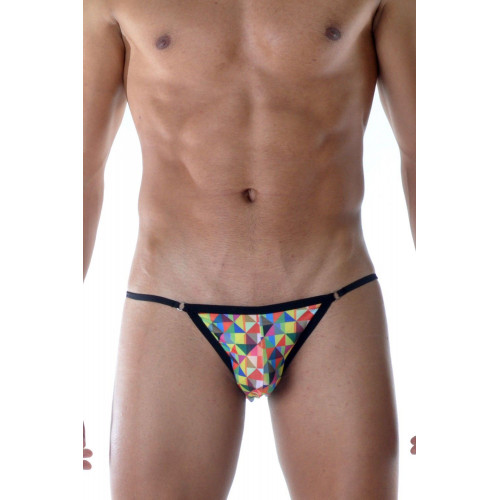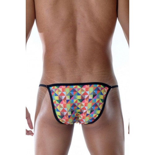 Яркие мужские трусы-танга с геометрическим принтом.
