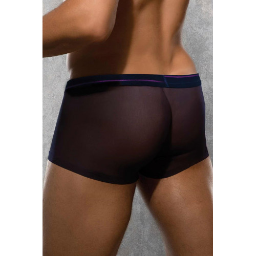 Очень сексуальные мужские трусы-хипсы из прозрачной эластичной тёмно-синей сеточки, спереди украшены контрастной сиреневой полоской. Мягкий эластичный материал. Стильная пришивная резинка на поясе с фирменным логотипом «DA» (DoreAnse). Передняя панель без подкладки.