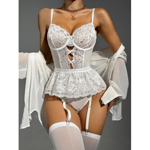 Белый кружевной боди корсет с имитацией маленькой юбочки и чулками отлично подчёркивает фигуру и придаёт образу женственности. Выполнено из сетки с кружевными вставками и кружевными чашками. Эластичные пажики для крепления чулок дополнят ваш образ. Материалы: 90% полиамид, 10% эластан. Размер XL. Цвет: белый.