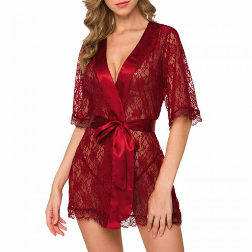 Пеньюар из нежного кружева с цветочным рисунком. Полы фиксируются атласным поясом. Длина рукава - до локтя. Длина по спинке - около 85 см. Трусики-стринги в комплекте. Цвет бордовый. Размер S/M (44-46).