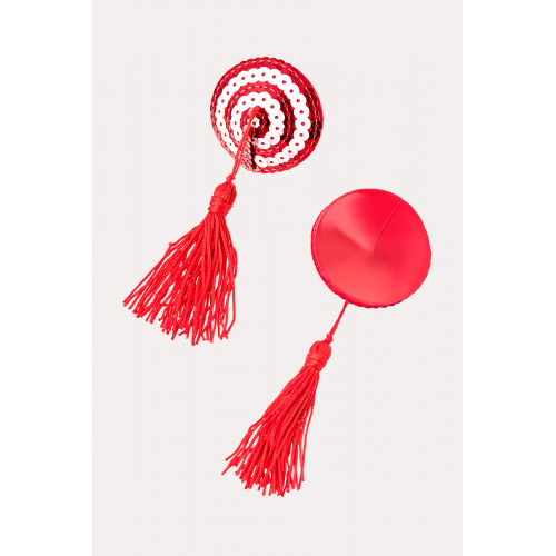Наклейки на соски многоразовые. Конус выполнен из полиуретана, внутри — слой силиконового геля. Декор: пайетки, кисточки.Размер основания: 5 см. Длина кисти: 11 см. Наклеивать на чистую кожу без следов косметических средств. Снимать осторожно. После использования внутреннюю сторону промыть теплой водой. Хранить, изолировав клейкий слой пленкой или приклеив к стеклянной поверхности (зеркалу). Не использовать при гиперчувствительности к силикону, нарушениях пигментации или повреждениях кожи груди.