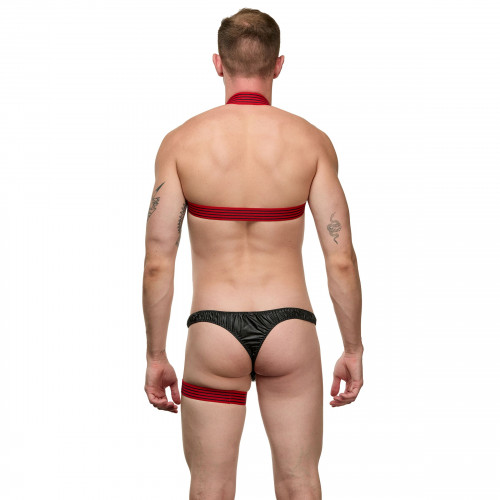 Мужской костюм «Танцор». Выполнен в черно-красном цвете и состоит из 3 предметов. В комплекте: трусы-тонги, подвязка на ногу, портупея.