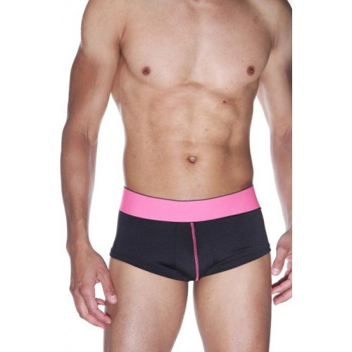 Мужские хипсы из эластичной черной ткани, с розовыми строчками и широким розовым поясом.