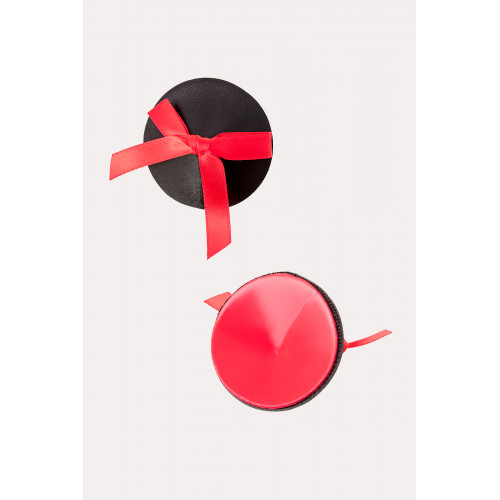 Наклейки на соски многоразовые. С контрастными бантиками. Конус выполнен из полиуретана, внутри — слой силиконового геля. Декор: искусственная кожа, сатиновые бантики. Размер основания: 5 см.Наклеивать на чистую кожу без следов косметических средств. Снимать осторожно. После использования внутреннюю сторону промыть теплой водой. Хранить, изолировав клейкий слой пленкой или приклеив к стеклянной поверхности (зеркалу). Не использовать при гиперчувствительности к силикону, нарушениях пигментации или повреждениях кожи груди.