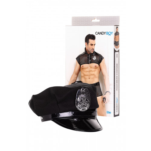 Стильный укороченный топ с отложным воротником легко расстегивается одним движением руки. Боксеры на широком эластичном поясе также дополнены провоцирующей молнией. Сочетание крупной сетки и материала wetlook выгодно подчеркивают достоинства фигуры. Пластиковые молнии без острых краев. Кепка с лаковым козырьком регулируется в обхвате. 2 значка с надписью City Police (англ. «Городская полиция») и пластиковые наручники входят в комплект.