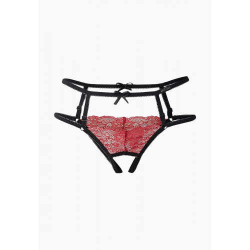 Провокационное сочетание красного кружева и черных лент для горячей штучки. Невесомые трусики с доступом и высокой талией заставят мужские сердца трепетать от восторга. «Секс…. Прямо здесь и сейчас» - вот что приходит на ум каждому, кто видит эту кокетливую модель на женском теле.