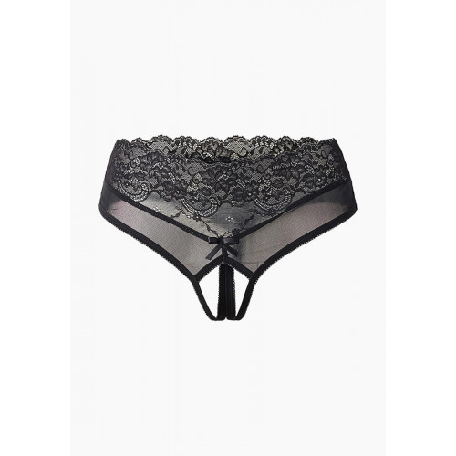 Изысканное сочетание кружева и полупрозрачной сетки превращает шортики с доступом в объект эротического поклонения. Крой задней части подчеркивает округлость ягодиц, добавляя им сексуальности. Женская фигура в этой модели выглядит хрупкой и соблазнительной одновременно.