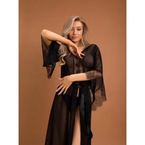 Этот длинный пеньюар создан для тех, кто желает выглядеть элегантно и изысканно. Этот наряд сделан из прозрачной сетки, что позволяет обнажить красивое женское тело, но в то же время не показывая его полностью. При этом, потрясающее тонкое французское кружево с ресничками, отделка края и низа, придают пеньюару особый шарм и изысканность. К тому же, благодаря расклешенным рукавам, этот пеньюар создает эффект легкости и плавности, а также подчеркивает тонкость и элегантность женских рук. В нем вы будете чувствовать себя уверенно и привлекательно, не снимая наряд даже во время близости. Это идеальный выбор для шикарной женщины, которая ценит утонченность и чувственность, и хочет показать это в своем наряде. Размер: S/M (соответствует российскому 42-44). Цвет: черный.