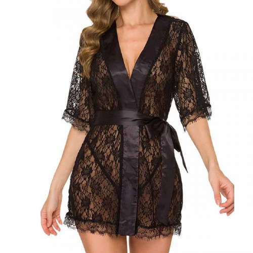 Пеньюар из нежного кружева с цветочным рисунком. Полы фиксируются атласным поясом. Длина рукава - до локтя. Длина по спинке - около 85 см. Трусики-стринги в комплекте. Цвет черный. Размер S/M (44-46).