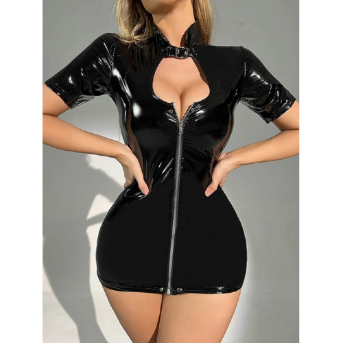Элегантное эластичное платье из ткани с эффектом wetlook, на молнии с воротничком стойка и пряжкой на шее это идеальный выбор для тех, кто хочет выглядеть сексуально и соблазнительно. Отлично садится по фигуре. Ткань плотно обтягивает ягодицы, придавая им прекрасную форму и подчеркивая их аппетитность. Цвет черный. Размер XS.
