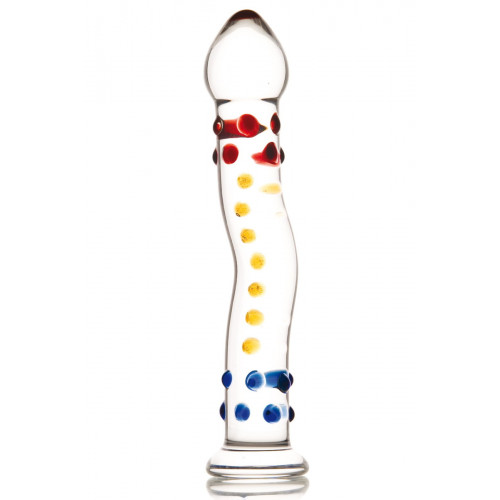 Крупная гладкая головка, волнующий изгиб, яркие точки, украшающие ствол и дарящие дополнительную стимуляцию, - этот фаллос из закалённого стекла выводит интимные игры на высочайший уровень! Ведь его изысканный и анатомически продуманный дизайн - лишь часть преимуществ. Стекло не бьётся, является самым гипоаллергенный материалом из имеющихся на сегодняшний день, за ним легко ухаживать и его можно нагревать или охлаждать. С таким фаллосом множественный оргазм неизбежен! Размер: общая длина 21 см, рабочая длина 20 см, диаметр: 2,5 -3 см. Для более комфортного использования рекомендуем приобрести смазку на силиконовой основе и очищающий спрей Clear Toy 100 мл для обработки изделия.