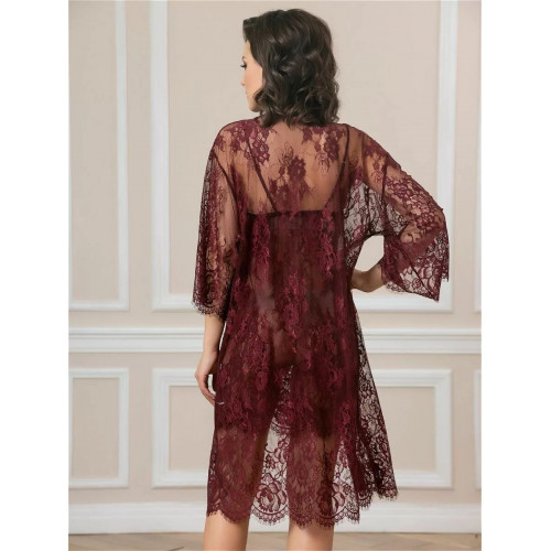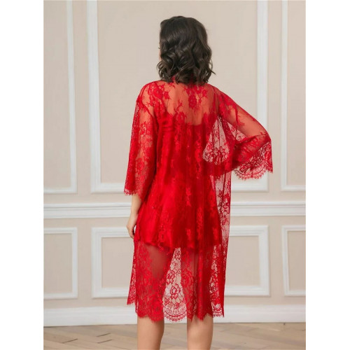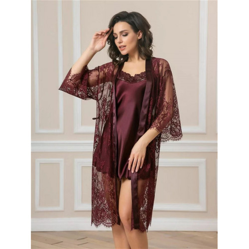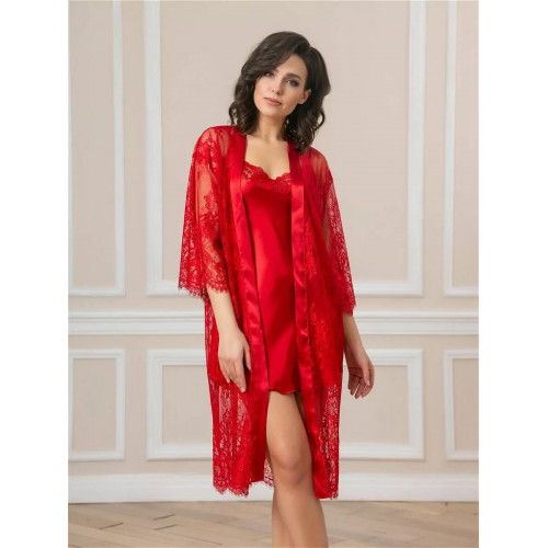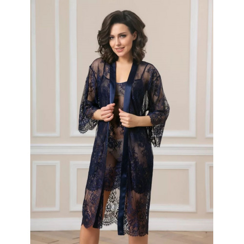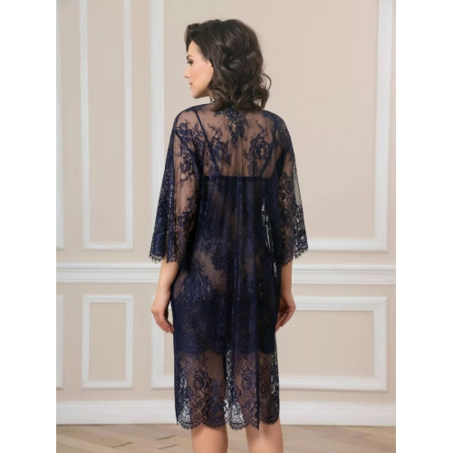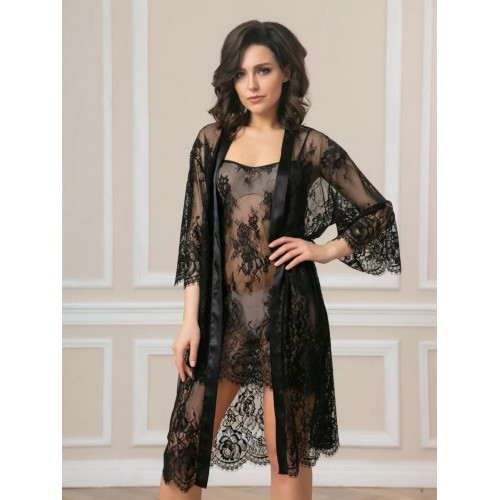 Короткий халат на запах из кружева с поясом, декорированный атласом по борту.