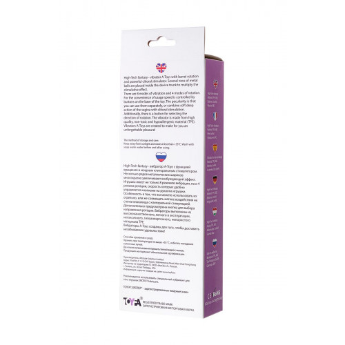 High-Tech fantasy - вибратор A-Toys с функцией вращения и мощным клиторальным стимулятором. Несколько рядов металлических шариков многократно увеличивают возбуждающий эффект. Игрушка имеет не только 8 режимов вибрации, но и 4 режима ротации, скорость которых удобно управляется кнопками на рукояти игрушки. Особенность в том, что вы можете использовать их отдельно, или же совмещать мягкое воздействия на стенки влагалища с клиторальной стимуляцией. Дополнительно предусмотрена кнопка для выбора направления ротации. Рабочая длина - 11,2 см.