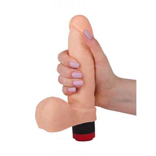 Этот телесный вибромассажёр точь-в-точь, как настоящая возбуждённая мужская плоть: от ярко выраженной мошонки до небольших складочек под большой гладенькой головкой.