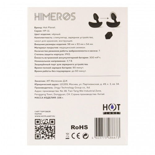 Himeros — небольшая анальная пробка с функцией надува и дистанционным управлением. В Himeros встроены два мощных мотора: первый расположен в рельефном кончике, а второй надувает пробку до 4.6 см в диаметре. Эти функции можно комбинировать, а можно использовать по отдельности, наслаждаясь вибрацией и ощущением наполненности по своему выбору.