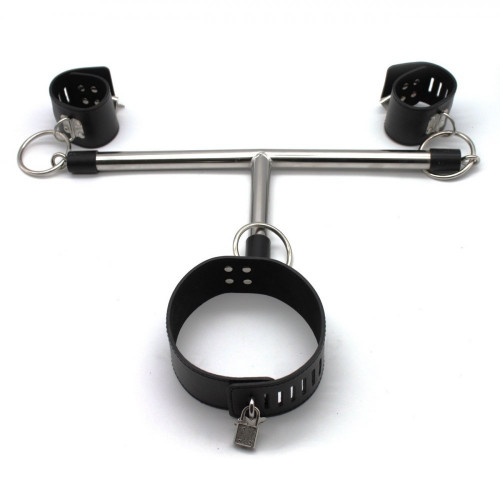 Фиксирующая BDSM распорка поможет ограничить подвижность партнёра. Девайс состоит из цилиндрической металлической основы, ошейника и наручников из искусственной кожи с велюровой изнанкой, для более нежного соприкосновения с кожей. Фиксирующие элементы подвижны относительно основы. Ошейник и наручники регулируемые и имеют фиксирующие замочки с ключами. Металлические части имеют никелевое покрытие. Размеры: длина распорки 45 см, длина ответвления на ошейник 17 см; длина ошейника 44 см, ширина 5 см; длина наручника 25 см, ширина 5,5 см. Цвет черный.