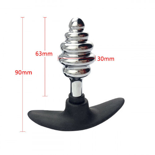 Ребристая анальная пробка для ношения – это стимулятор, имеющий волнообразную проникающую анальную часть и анатомически изогнутое основание из силикона, что позволяет носить пробку внутри тела и использовать во время полового акта. Идеально подходит для повседневного ношения, сужения влагалища, стимуляции и подготовки к анальному сексу. Литая анальная пробка имеет конусообразную ребристую форму и гладкую фактуру шлифованного металла. Легкий и прочный алюминиевый сплав гарантирует долговечность и гигиеничность, а также абсолютную безопасность даже при постоянном ношении. Гладкая и мягкая силиконовая подставка в форме треугольника не даст пробке выпасть или, наоборот, провалиться внутрь прямой кишки и делает ее идеальной для ношения. Размер: общая длина 9 см, глубина введения 6,3 см, диаметр 3 см. Цвет: основание черное, втулка серебристая. Для более комфортного использования рекомендуем приобрести смазку на водной основе и очищающий спрей Clear Toy 100 мл для обработки изделия.